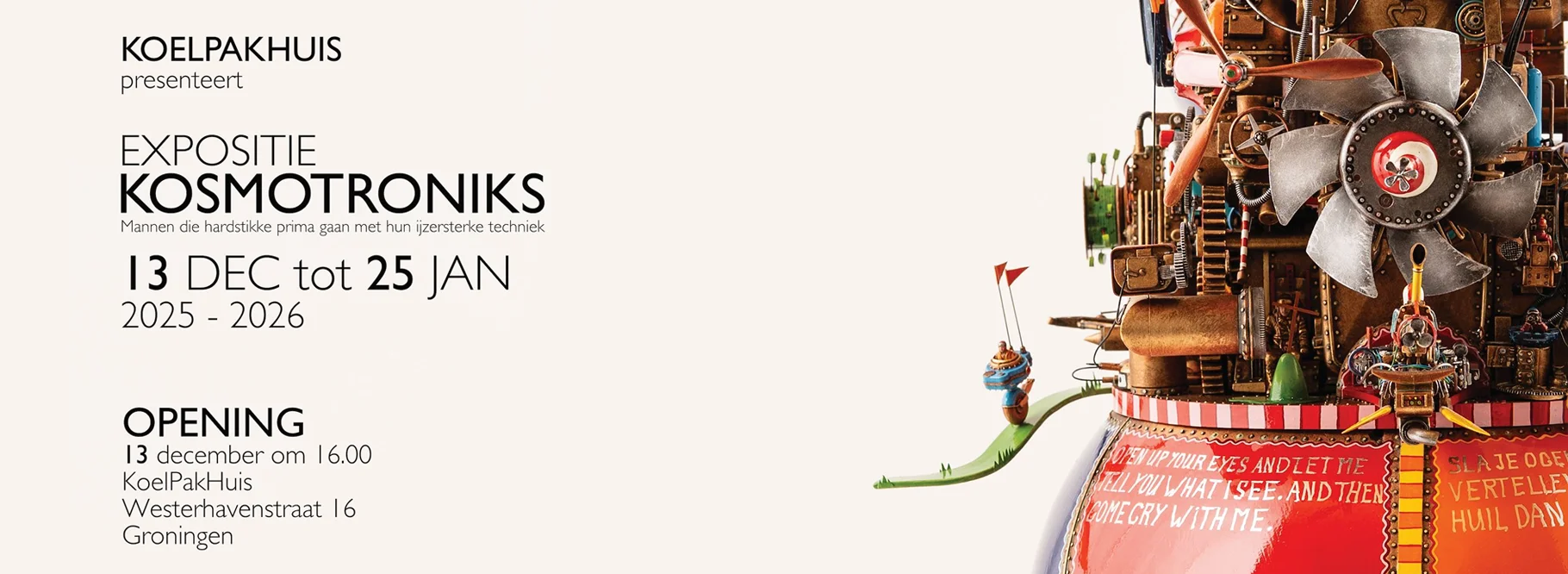 News EXPOSITIE KOSMOTRONIKSKoelPakHuisWesterhavenstraat 16 Groningen13 DEC tot 25 JAN 2025 - 2026Opening 13 DEC 16.00 Kosmotroniks WinterWelVaart 202519, 20 en 21 decemberKunstroute - WinterWelVaart KOELPAKHUIS presenteert Optreden ARLING - Come Cry With Me. Muziek van Gerry Arling. 16 en 17 januari 2026.Come Cry With Me KOSMOTRONIKS EXPO27 september 2025 t/m 05 januari 2026MuzeeAquarium DelfzijlMuzeeAquarium Delfzijl (Groningen) - museum en zeeaquarium PAST EVENTS Expositie MOTJE17 OKT tot 8 NOVOPENING Vrijdag 17 OKT 14.00KoelPakHuisWesterhavenstraat 16 GroningenEXHIBITION MOTJE KOSMOTRONIKS GO NOORWEGENGalleri Langegaarden30 aug t/m 28 sep 2025https://langegaarden.no/ KOSMOTRONIKS Plastic en Kartonmet Wijnand DriessenWesterhavenstraat 16 Groningen11 mei t/m 22 juni 2025https://weareplaygrounds.nl/slot/wijnand-driessen/ KosmotroniksTerug Naar Het Begin23 + 24 + 25 Mei 2025Gemeente Eemsdeltahttps://terugnaarhetbegin.nl/ Kosmotroniks Exposition KUNSTROUTE BEEMSTER 20 & 21 April / 1e & 2e paasdag 2025http://kunstroutebeemster.nl/ Kosmotroniks Exhibition VOS Design Laan Corpus den Hoorn 100 / Netherlands3 December 2024 / 5 Januari 2025https://vos.design/ Kosmotroniks Exhibition Kerk in Adorp Torenweg 8 / Netherlands29 - 30 June / 6 - 7 July 2024www.CCAdorp.com Kosmotroniks meetsBen Feringa.Festival der VerwonderingSPOT Groningen / Netherlands22 May 2024http://www.festivalderverwondering.nl Kosmotroniks Exhibition KoelPakHuisWesterhavenstraat 16 Groningen / Netherlands18 May - 30 June 2024Open Saturdays and Sundays from 15.00 till 18.00 GRONINGER MUSEUM BUYS THREE KOSMOTRONIKSAND ARE PERMANENT ON DISPLAYhttps://www.groningermuseum.nl/ Kosmotroniks Expo in Pakhuis Groningen / Netherlands Kosmotroniks Expo Beelden in Gees / Netherlands 18 April - 06 October 2024https://www.beeldeningees.nl/ Kosmotroniks Expo ’t Clockhuys Haren / Netherlands 8 January - 02 March 2024 https://clockhuys.com/ KOSMOTRONIKS EXPO 21 OCT- 26 NOV 2023 OPEN EVERY SATURDAY & SUNDAY / 15:00 - 18:00 KOELPAKHUIS / WESTERHAVENSTRAAT 16 GRONINGEN OPENING: 21 OCT / 15:00 Kosmotroniks Expo Micksart Gallery Emmen / Netherlands 2023-2024https://micksartcollectief.nl Kosmotroniks Expo De Lawei Drachten / Netherlands 1 April - 14 May 2023https://www.lawei.nl Kosmotroniks Expo Galerie Museum (MUGA) Heerenveen / Netherlands 22 January - 26 February 2023https://www.heerenveenmuseum.nl/muga Maker Fair Eindhoven / Netherlands 24 & 25 September 2022https://eindhoven.makerfaire.com Affordable Art Fair F1 Pit Building / Singapore 18 - 20 November 2022https://affordableartfair.com/fairs/singapore/ Floriade 2022 Almere Circuloco pavilion / Netherlands 1 & 7 & 8 & 9 October 2022https://floriade.com Trommel Festival Aartswoud / Netherlands 10 & 11 September 2022https://www.trommelfestival.nl/ Teknowlogy Festival in de Fabrique Utrecht / Netherlands 31 May 2022https://www.nwo.nl/en/meetings/teknowlogy-nwo-innovation-festival Maker Fair Gent / Belgium 30 April & 1 May 2022https://www.makerfairegent.be/